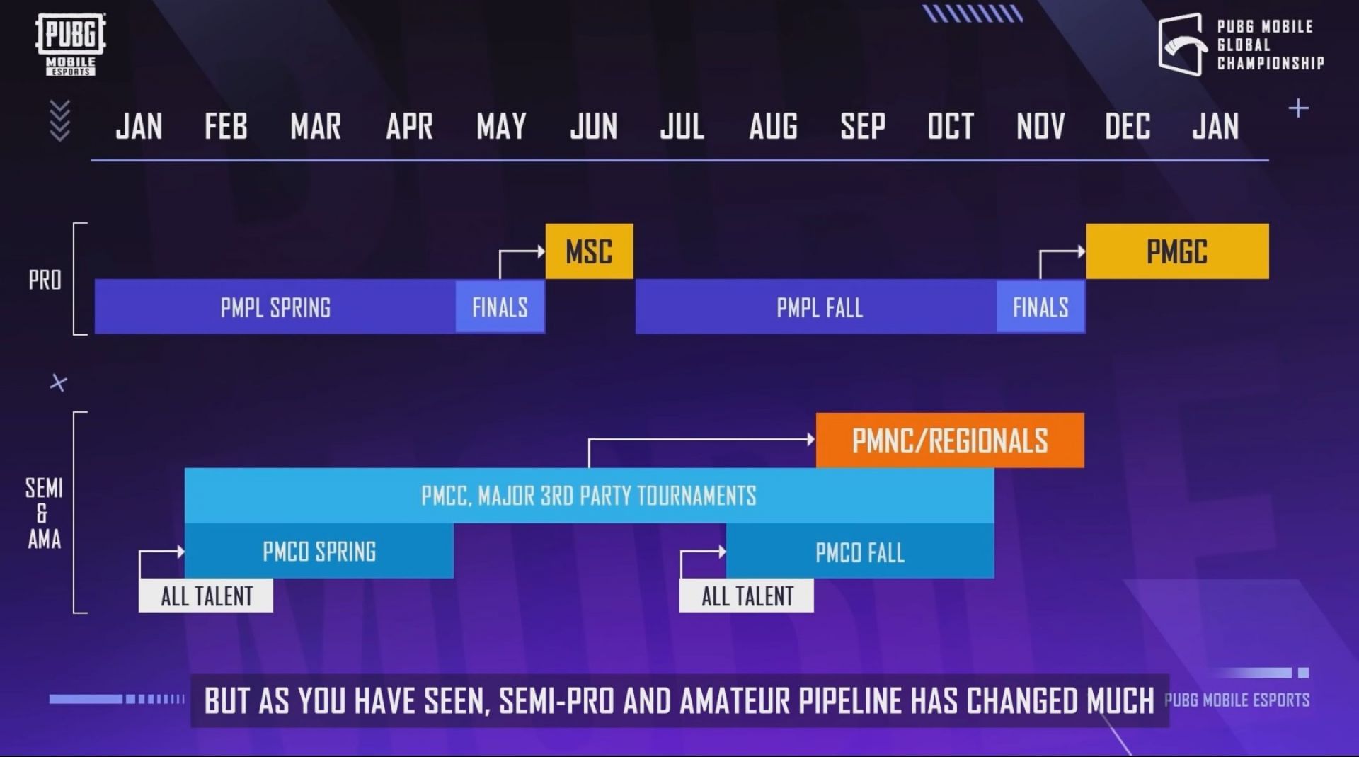 The majority of the pro circuit will function as it is, however, Pro leagues (PMPL's) have been introduced to the Pakistan and Africa regions. Other than that, the months of January to June will feature the spring season, while the fall season will take place between July and November. The Mid Season Championship (MSC) and the PMGC 2022 will be played in between, and at the end of the splits respectively.
