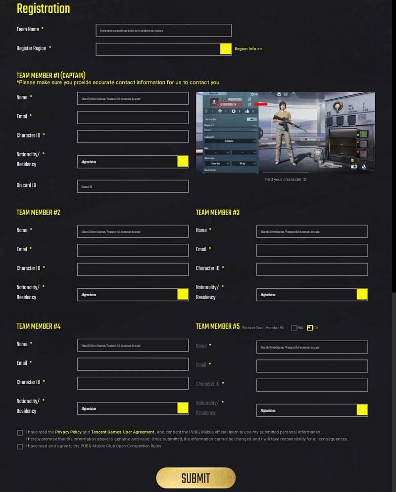 Step 4: They may fill in the player's information, such as name, email id, character id, nationality, etc.