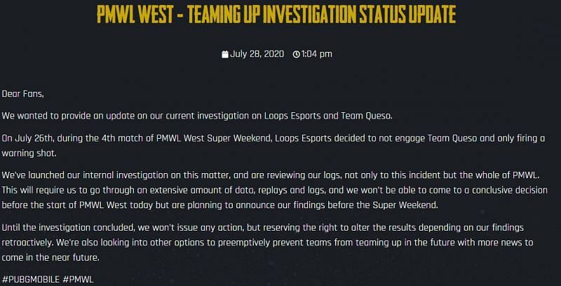 PUBG Mobile Esports officials have released a statement regarding this incident, and have assured fans that they would investigate and resolve the matter before the PMWL 2020 West Super Weekend.