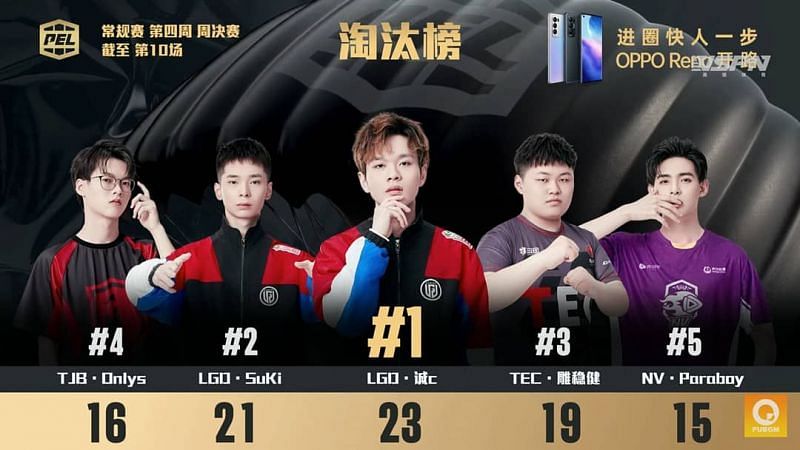 At the end of week 4 of PEL 2021 season 1, LGD topped the weekly points table with a total of 67 kills and 124 points. Following them closely was the week 1 champion TEC with 54 kills and 102 points.