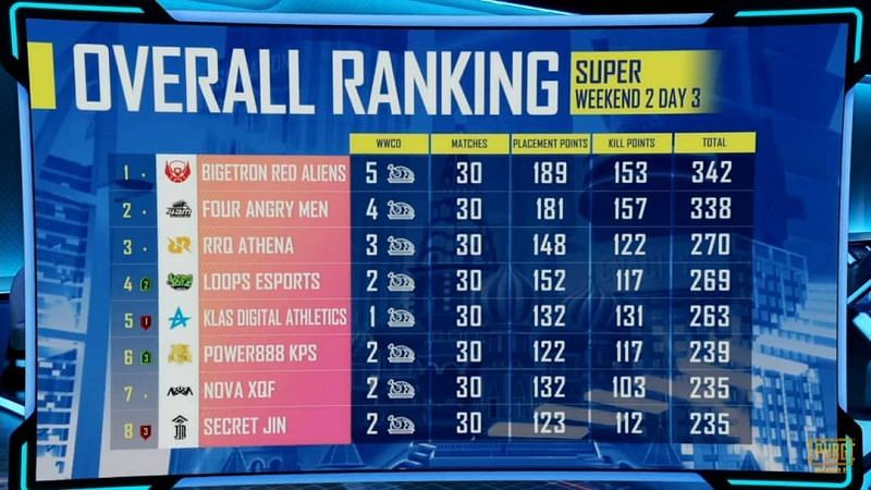 Bigetron RA leads the points table at the end of Day 3 of super weekend 2 with a total of 153 kills and 342 points to their name. Following them closely is Four Angry Men with 157 kills and 338 points. RRQ Athena has taken the third position with 270 points to round off the top teams. Nova XQF is in 7th place with 235 points.