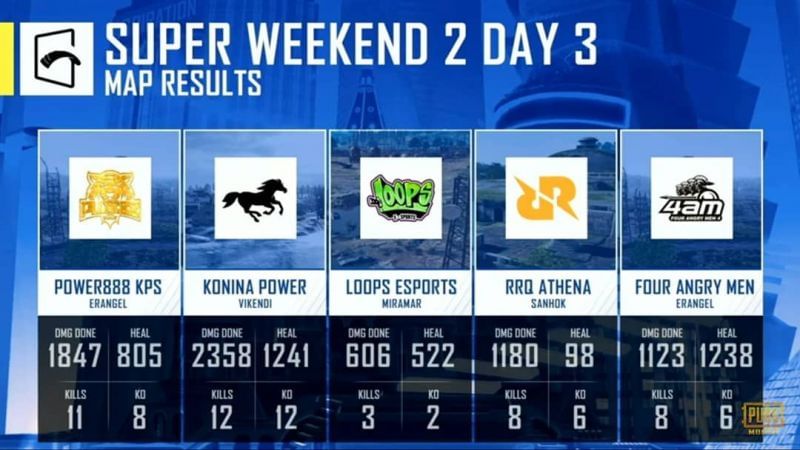 The third match, played on Miramar, was won by Loops Esports with three kills. However, Power888 KPS topped the match table with 10 kills.