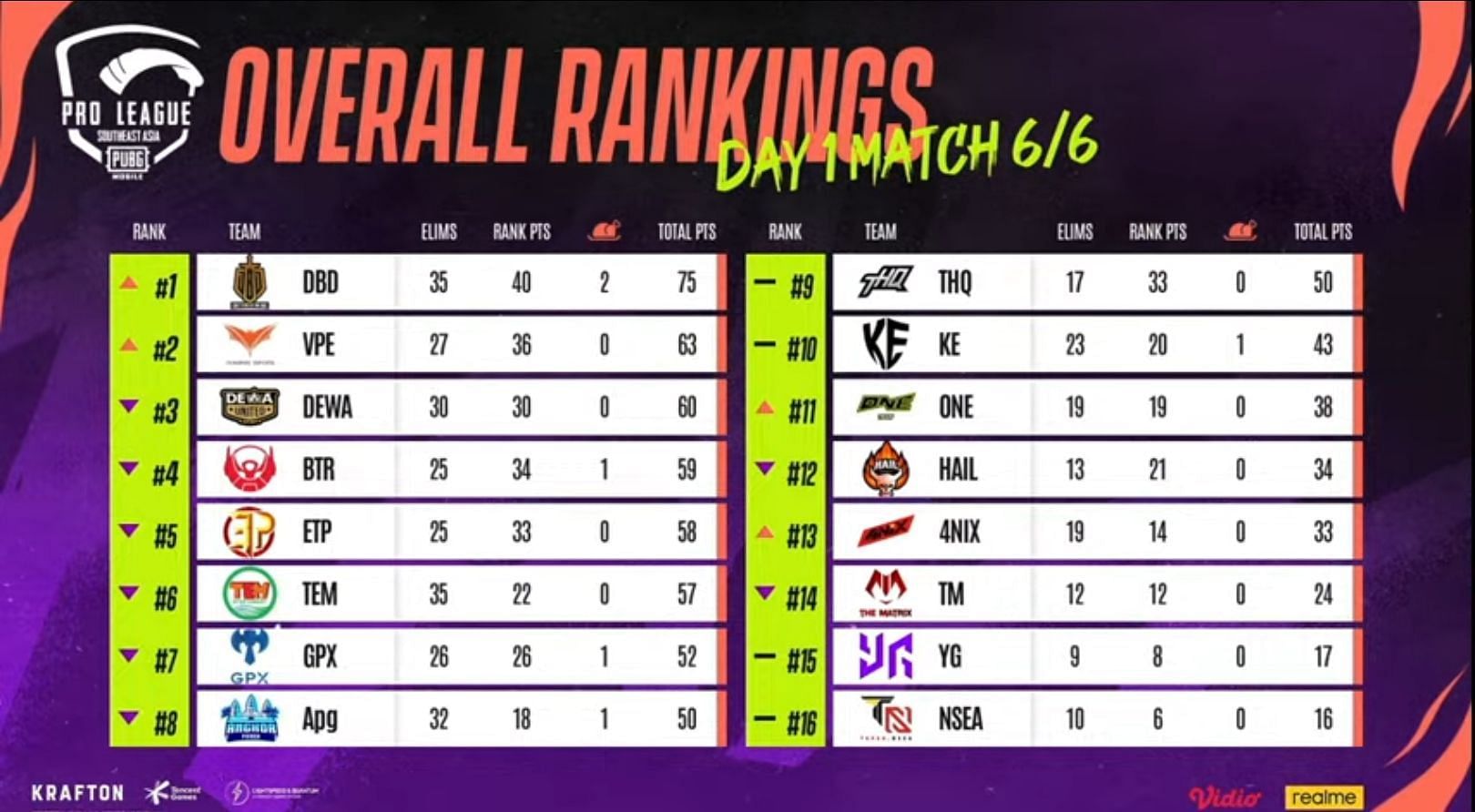 Day 1 of the PUBG Mobile Pro League (PMPL): SEA Play-Ins Fall 2022 ended after an exciting six-match fiesta. Malaysian squad Don't Break Dreams captured the top spot with 75 points and 35 eliminations. Owing to their impressive performances, the side were able to secure two chicken dinners in six matches.