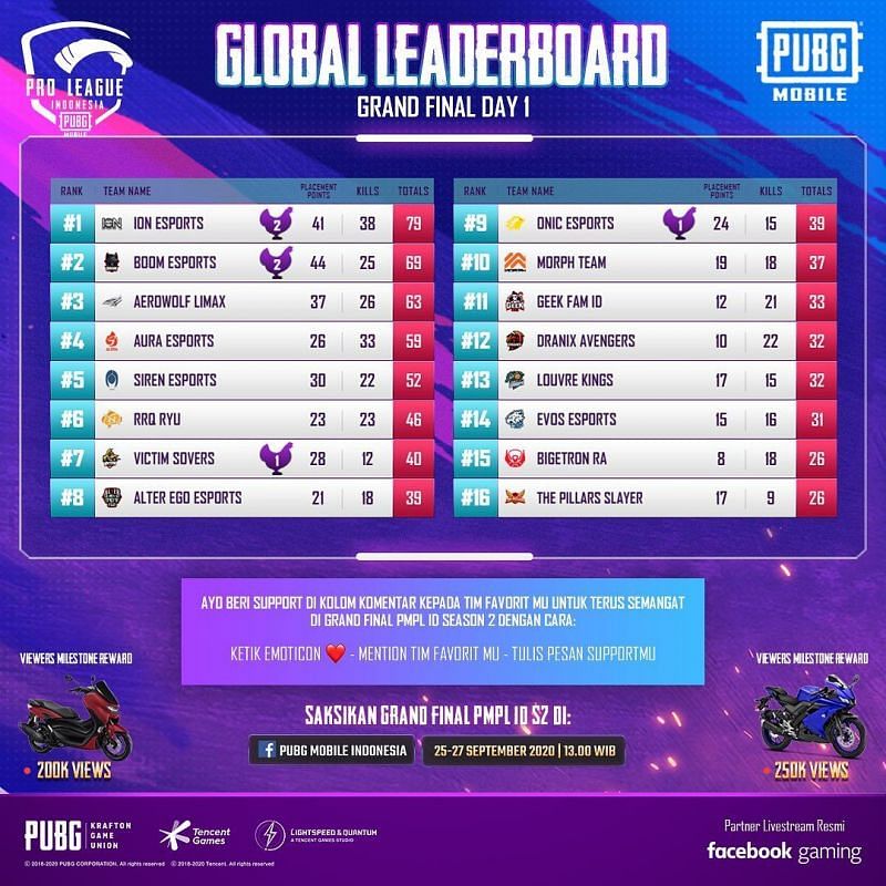 PMPL Season 2 Indonesia Grand Finals Day 1 overall standings