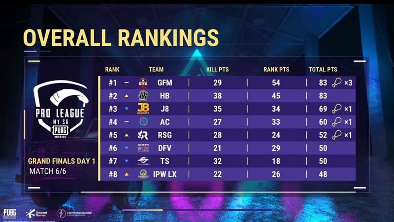 The sixth and final match of the day was won by RSG with 11 kills, while Home Bois again secured second place with 11 frags. Team Secret although were eliminated early but managed to grab 11 kills.
