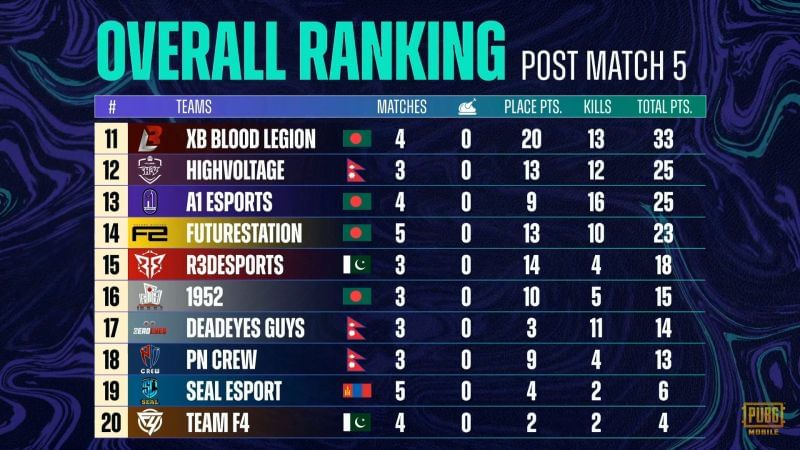 PMPL South Asia Season 3 week 2 day 1: Overall standings