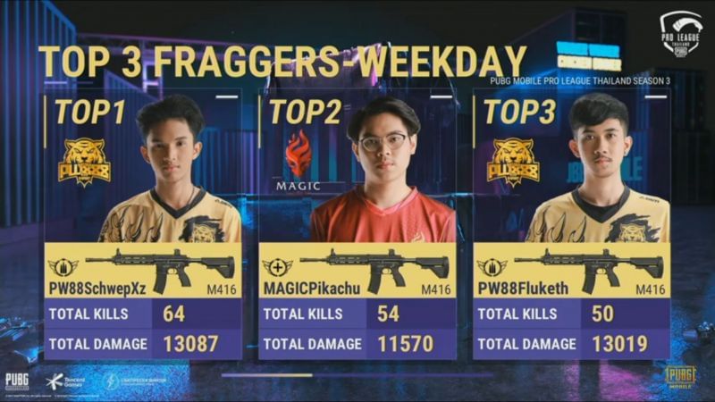In the overall kill leader-boards for the weekdays, SchwepXz, who has been dominating the list from the start, stayed at the top with 64 kills and 13807 damage. Following him in the second place was Pikachu from Magic Esport, the new entrant on the list with 54 kills and 11570 damage. The third place in the overall kill leaderboards was taken by Fluketh from Power888KPS with 50 kills and 13019 damage.