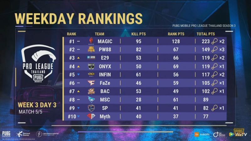 The third day of the third week of the PUBG Mobile Pro League (PMPL) Season 3 Thailand came to an end today. After an exciting day of play that saw the players perform to their absolute best to qualify for the final super-weekend, Magic Esport emerged at the top of the leaderboard with 223 points and 95 kills. Following them in second place was Power888KPS with 149 points and 82 kills. The third place at the end of the final weekday was claimed by E29 Gaming Esports.