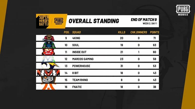 Here are the overall standings of PUBG Mobile Super Heroes Battle after Day 1 of Week 2.