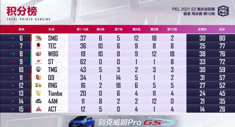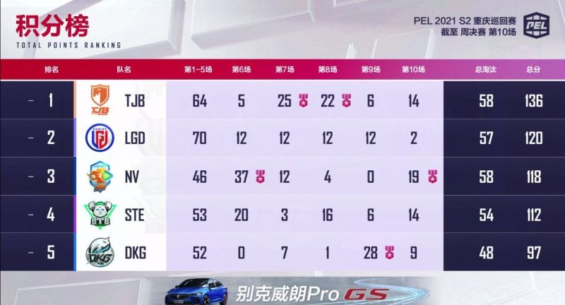At the end of the first week, TJB leads the points table with a total of 58 kills and 136 points to its names. Following it closely is LGD Gaming, with 57 kills and 120 points.