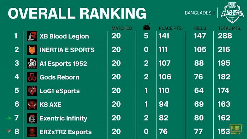 The first match played on Erangel was won by XB Blood Legion with 18 eliminations. A1Esports1952 claimed the second match at Sanhok with 12 kills.