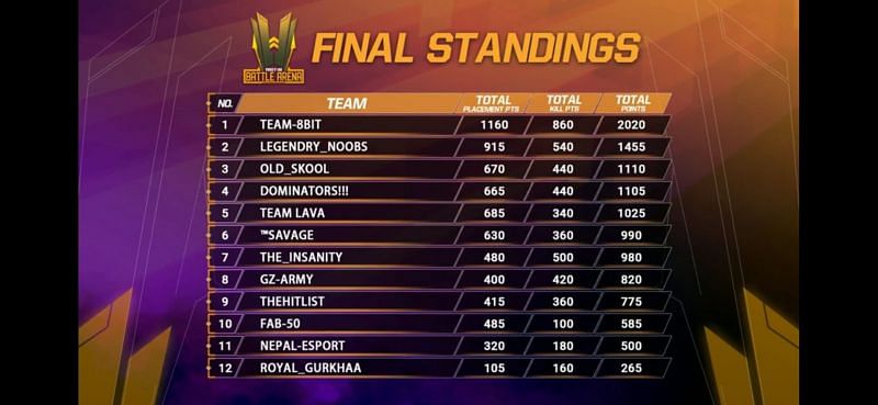 A dominant TEAM 8Bit emerged as champions in the Free Fire Battle Arena Championships that concluded today. They got three Booyah in total, with 1160 placement points and 860 kills points adding up to 2020 total points for them in the finals. Legendry Noobs and Old Skool placed second and third, respectively, with 1455 and 1110 points each.