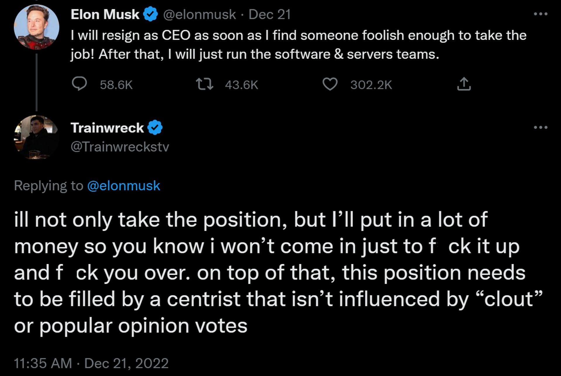 As a political commentator on Twitch, HasanAbi has been extensively covering the Elon Musk and Twitter saga. Musk recently created a poll asking Twitter users to decide if he should step down as the CEO of the platform. After the results were in, he announced via a tweet that he would resign as soon as he found a suitable candidate to replace him. Trainwreckstv's responded to this tweet and requested to be considered for the position.