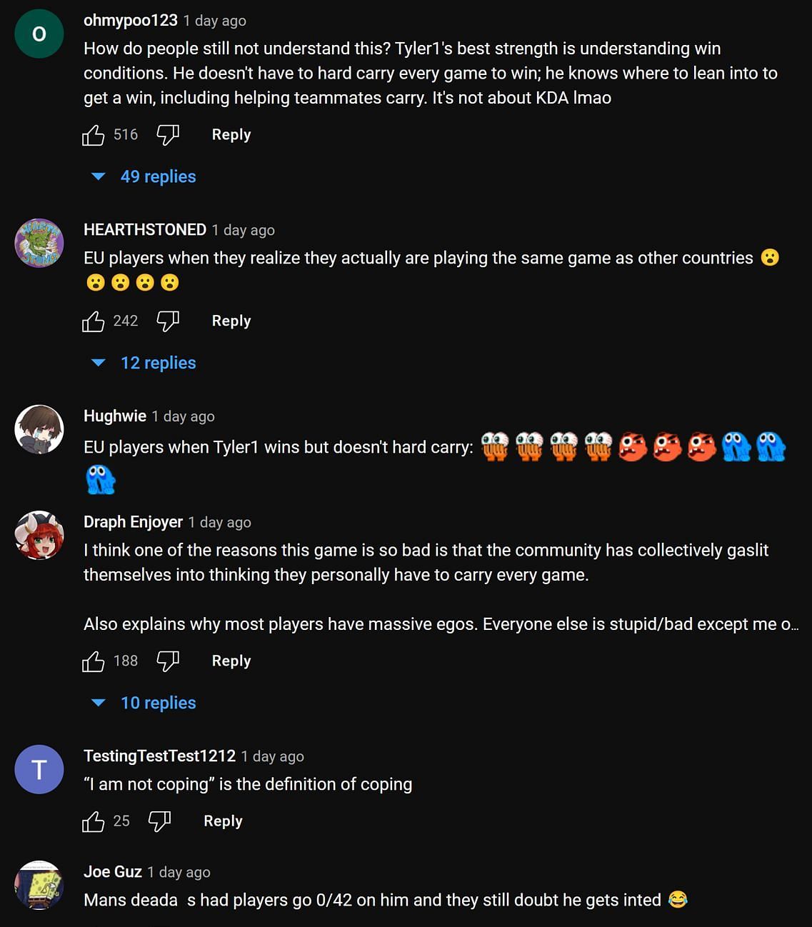 With more than 347 viewers weighing in, one community member stated that Tyler1 clearly understands win conditions in League of Legends, which results in him winning more games. Meanwhile, another fan remarked that LoL players have "collectively gaslit" themselves into believing that they can carry every ranked game.