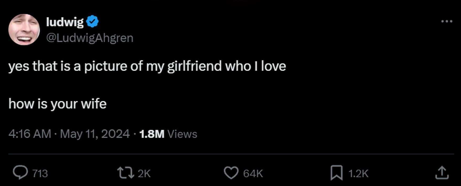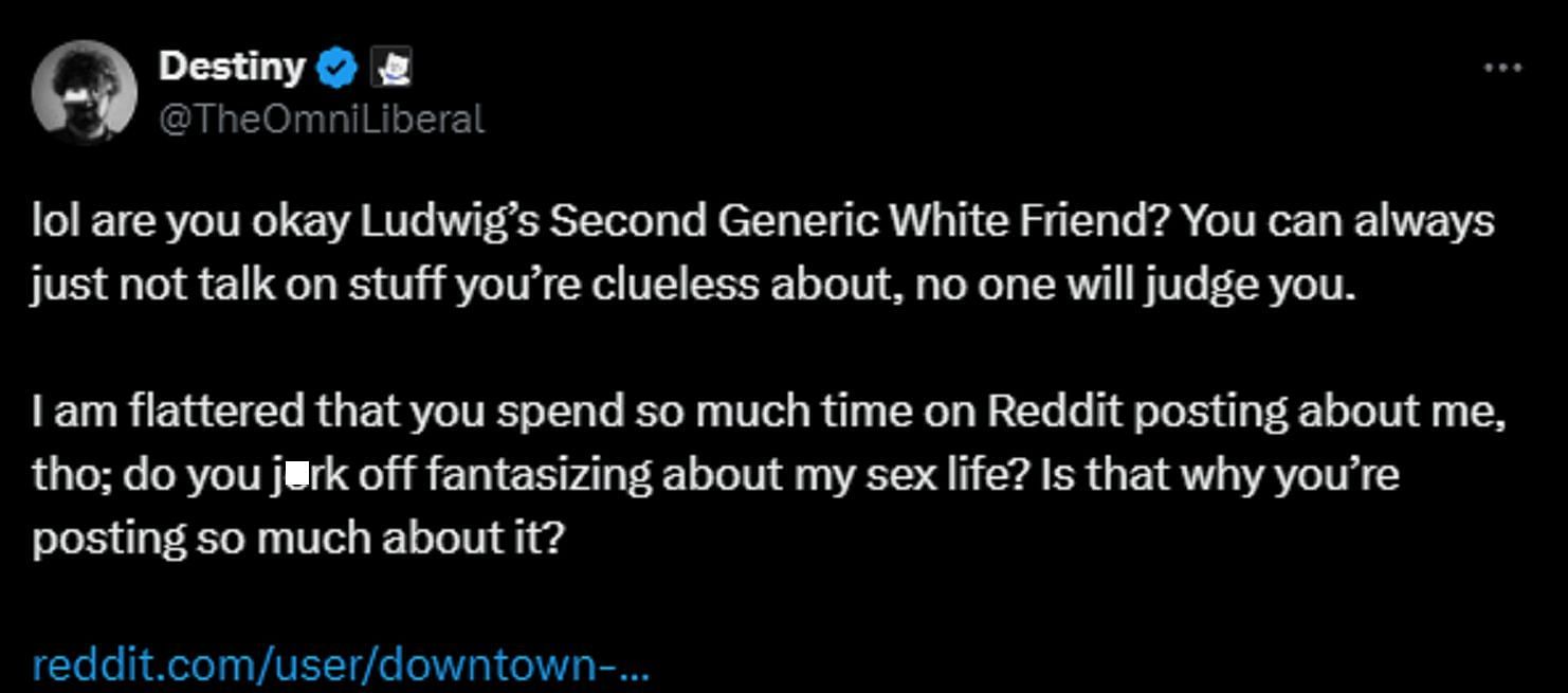 Ludwig saw this comment and swiftly made a quirky response that garnered tens of thousands of likes. The YouTube streamer cheekily inquired about Destiny's ex-wife: