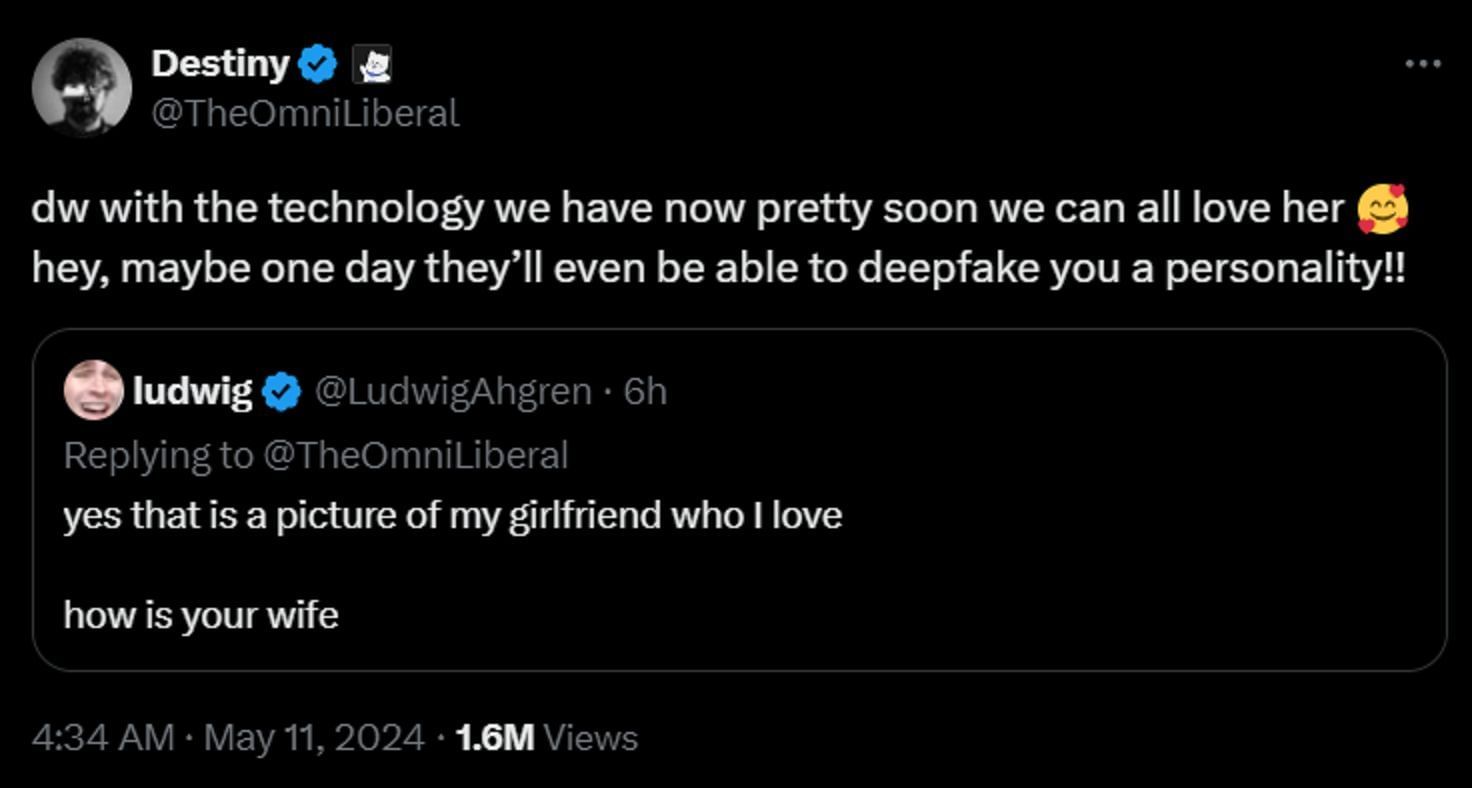 "Maybe one day they’ll even be able to deep fake you a personality (also a refrence to Blaire's deep fake controversy)."