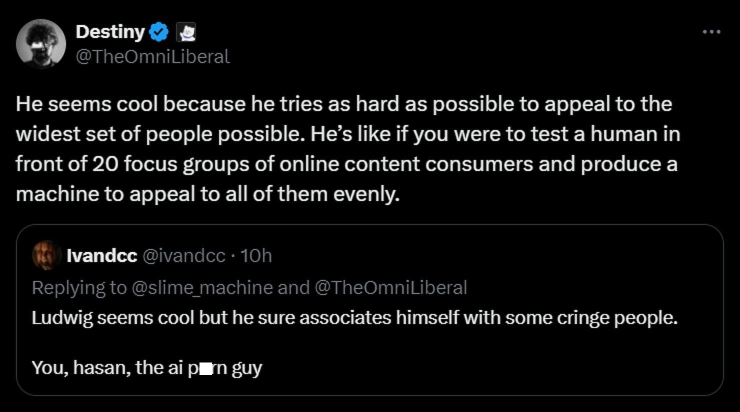 After this post, X user @ivandcc stated that Ludwig associates himself with "some cringe people." Steven retweeted the comment and added his thoughts: