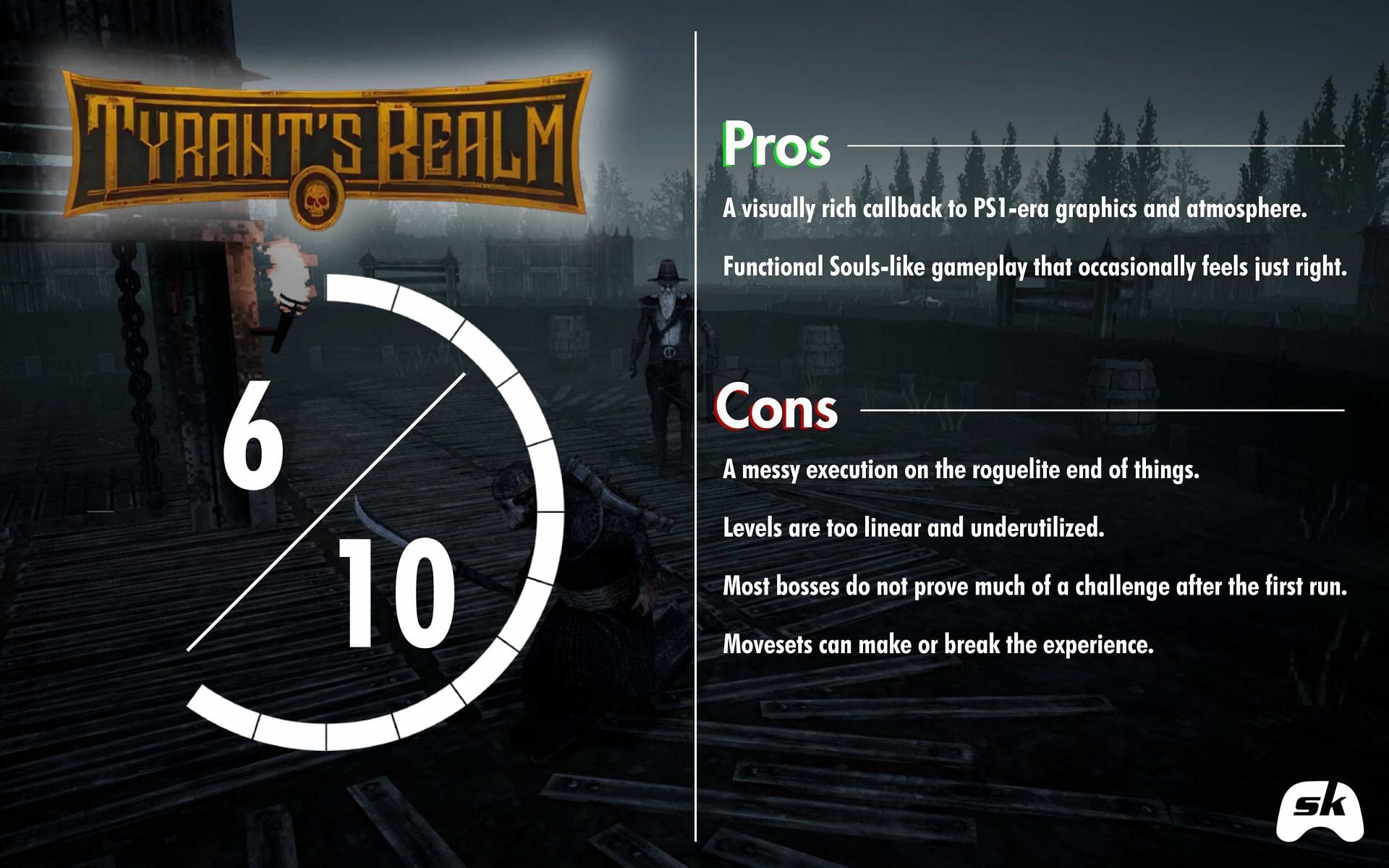 Ultimately, some questionable design choices and hit-or-miss movesets deflate what is otherwise a great Souls-like proof of concept. The salvageable portions of Tyrant's Realm make it a fun few hours till you hit your first serviceable gear combo and end the run.