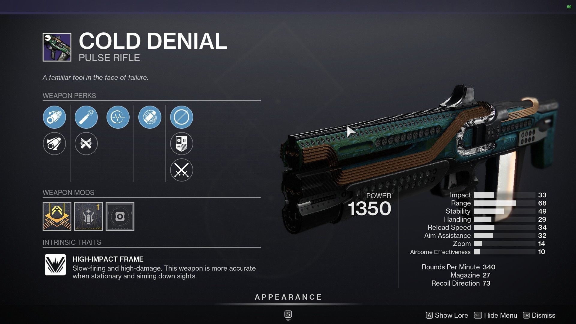 To start, the Cold Denial Pulse Rifle comes with the following perks for PvP: