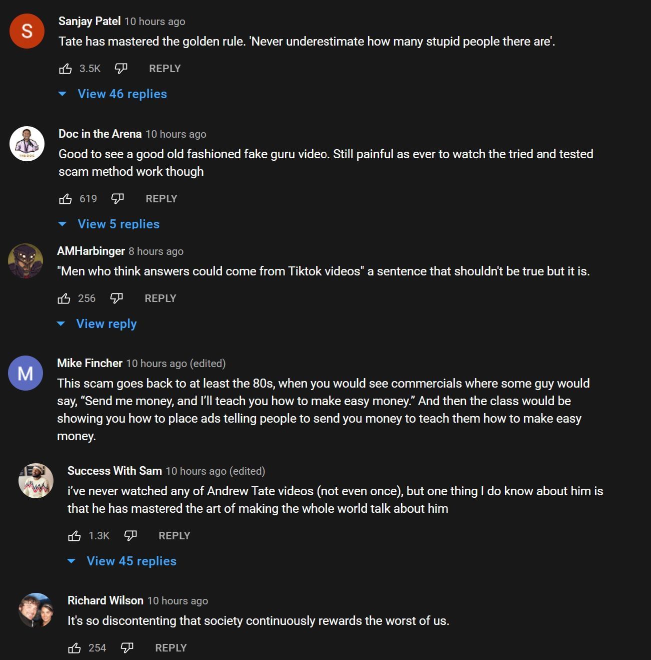 Viewers have been largely skeptical of Tate's new venture. Many people believe that it is no more than a scam. Tate himself has been controversially involved in any fraudulent charges. The following are some of the comments that were made on the YouTube video: