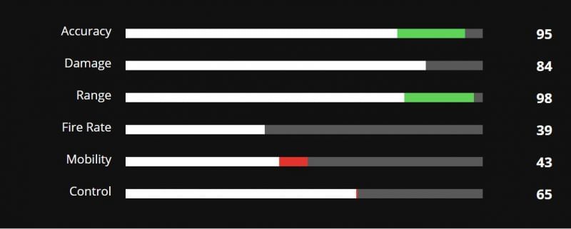 The attachments of this blueprint only bring slight decreases in mobility and control. The real changes come in the form of heightened accuracy and range. Those two categories get massive boosts from the Darkwood setup.