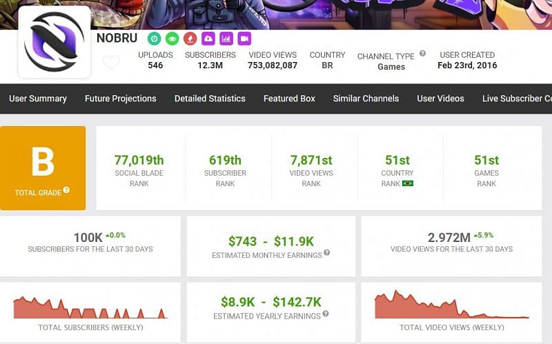 Nobru has gained 100k YouTube subscribers and 2.97 million views in the last 30 days.
