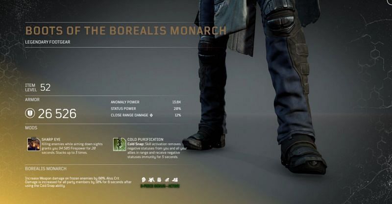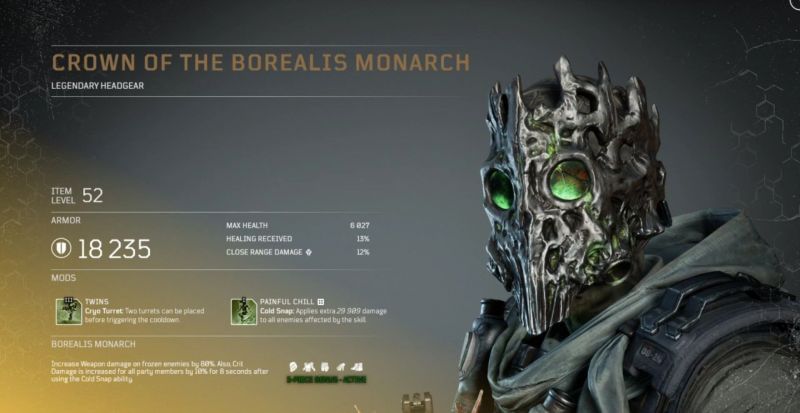 Having at least three out of these five Borealis Monarch armor pieces on a character grants an additional 80% weapon damage on frozen enemies. All party members also get a 10% Crit Damage buff for eight seconds after the Coldsnap skill is activated in Outriders.