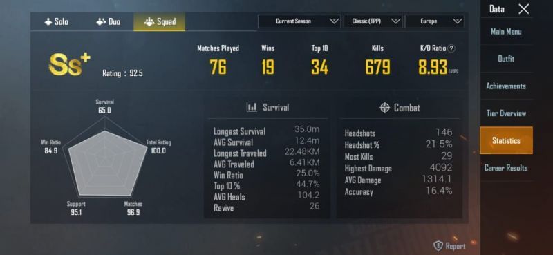 In the ongoing season, Panda has played 76 squad matches on the European server and won in 19 of them. He has over 600 kills with an awe-inspiring K/D ratio of 8.93.