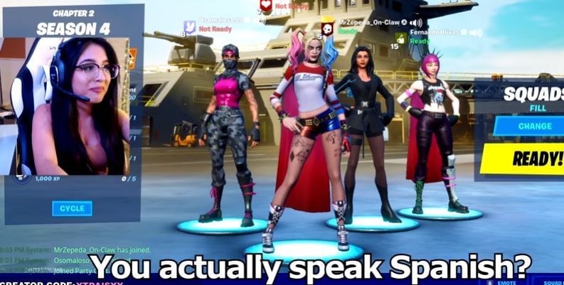 Towards the beginning, we see the streamer ending up in a Fortnite squad which has three Spanish speaking guys. However, one of the guys can understand English, even though he cannot speak the language perfectly. DaisyyMichelle tells him that he will have to translate what the others are saying because she can only speak English, which is obviously a lie.
