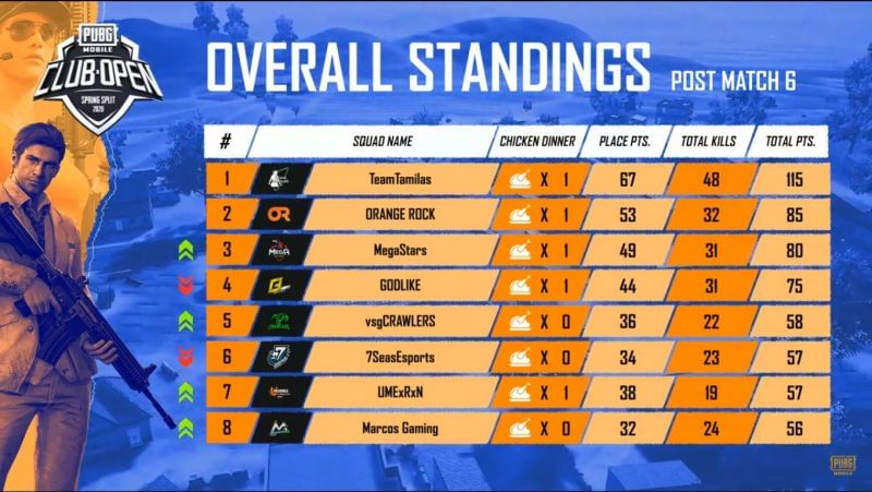 A total of 6 games were played on the first day, and after Day 1, Team Tamilas topped the leader-board with one chicken dinner and 115 points. Orange Rock and Mega Stars followed them with 85 and 80 points, respectively.