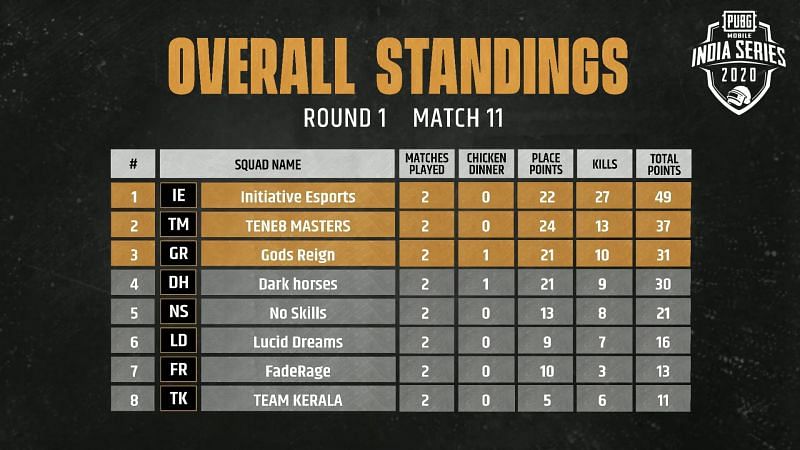 In the eleventh match, Initiative Esports dominated and conquered the top spot in the leaderboard with 41 points and a chicken dinner. They were followed by Tene8 Masters and Gods Reign with 37 and 31 points respectively.