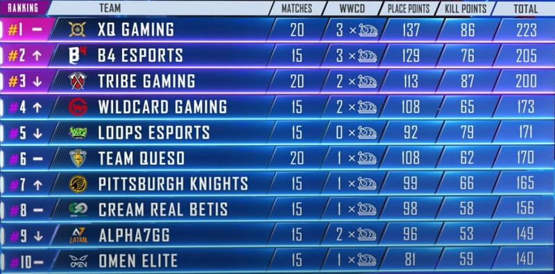 At the end of Day 4, XQ Gaming continues to be top with 223 points. B4 Esports follows with 205 points, with Tribe Gaming in third on 200 points.