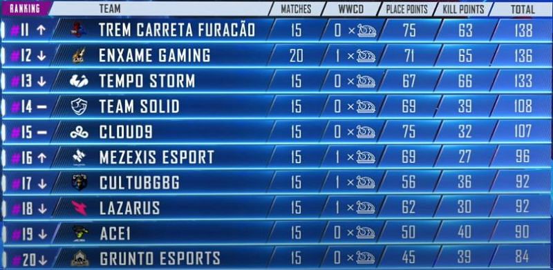 B4 Esports has played only 15 matches, whereas the other two podium teams have completed 20 matches each.