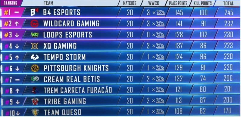 The first match on Erangel was won by Cream Real Betis. The second match on Miramar was won by Tempo Storm. Wildcard Gaming and Team Solid won the 3rd and the 4th matches, on Sanhok and Vikendi respectively. Trem Carreta Furacão stunned the opponents with their gameplay to get the chicken dinner in the final match on Erangel,