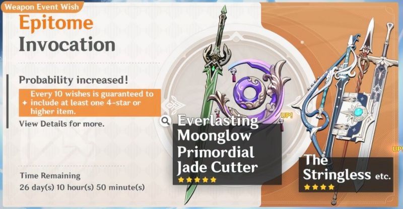 The new weapon banner will feature Everlasting Moonglow and Primordial Jade Cutter. Everlasting Moonglow is a brand new 5-star Catalyst weapon whose secondary stat is HP, and it will boost the user's Healing Bonus by 10/12.5/15/17.5/20%.