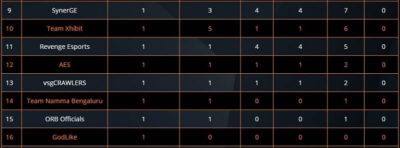 After Day 1, Orange Rock top the leaderboard with a total of 30 points. They are followed by Elxr Athena and Optimum Esports, who earned 21 and 15 points respectively.