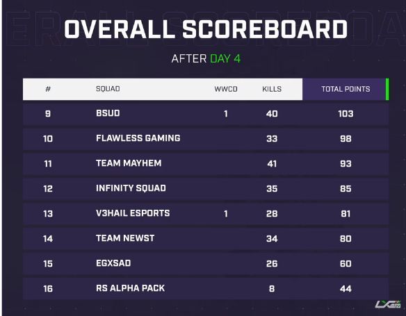 BSUD won the last match of the day of Erangel. They got 10 kills, Flawless Gaming came second with 9 kills.