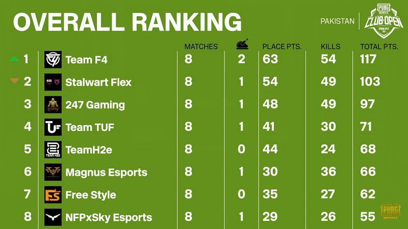 The second day of the PUBG Mobile Club Open(PMCO) Spring Split 2021 Pakistan finals concluded with Team F4 leading the table. A total of four matches were played on Erangel, Miramar, and Sanhok.