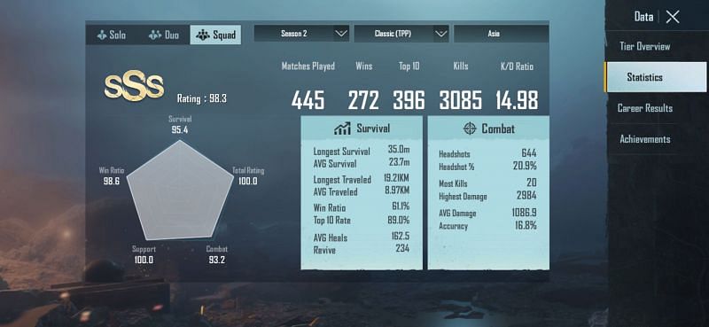 In Season 2 of the game, he reached Conqueror with an impressive K/D ratio of 14.98. His average damage in the season was 1086.9, and overall accuracy was 16.8%.