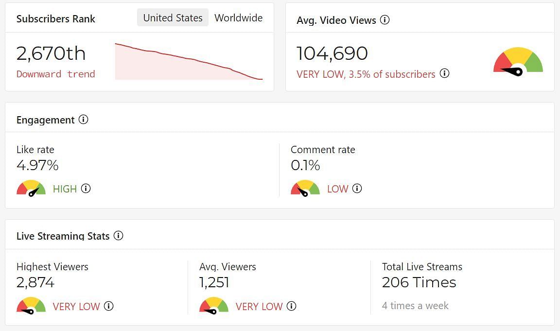 Since the start of the year, LilyPichu has faced a downward trend regarding her subscriber count on YouTube Live. With a total of 206 live streams in 2023, Lily is averaging about 1.2K viewers per live stream as of this writing, with the highest concurrent viewer count reaching just below the 2.8K viewers mark, a long fall from what her Twitch statistics used to be.