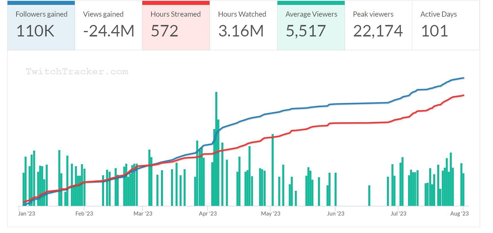 On the other hand, QuarterJade has streamed for just 101 days while enjoying a growth of 110K followers within the past eight months. With a total stream time of 572 hours, Jodi achieved a peak viewership of 22,174 viewers and maintained an average of 5.5K viewers per live stream, contributing to over 3.16 million hours in terms of content watched.