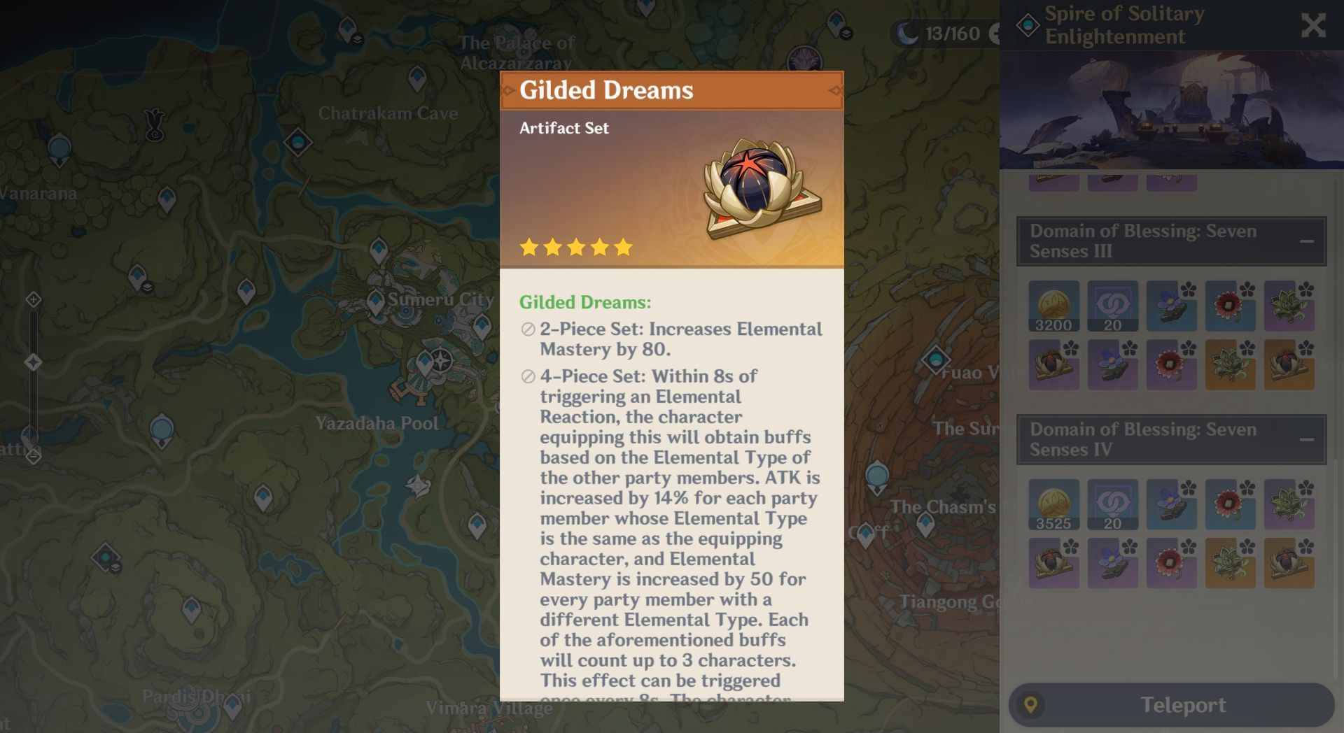 Gilded Dreams is another great option for Raiden Shogun Hyperbloom build. While this set does not buff any damage, it provides the unit with a ton of ATK and EM depending on the Elemental Type of the party members.