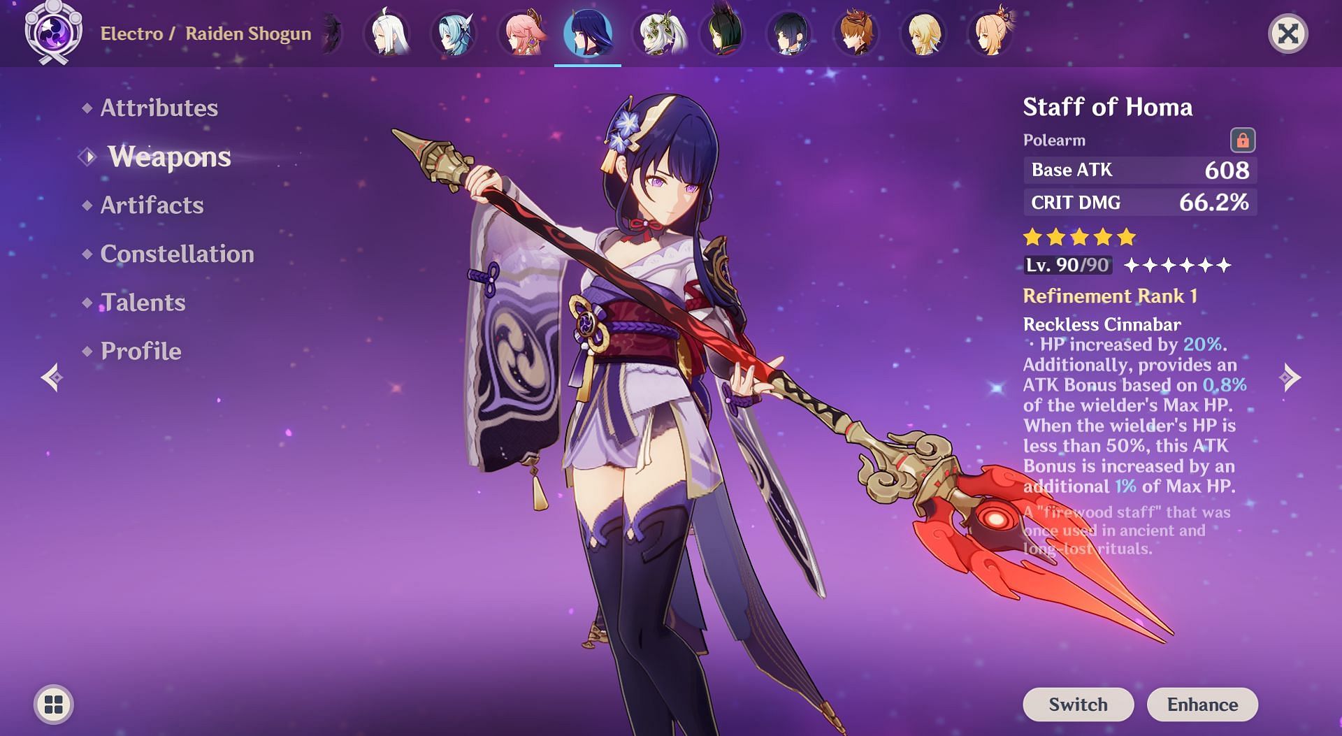 Staff of Homa is one of the best 5-star weapons in the game and is a great option for Raiden Shogun in Genshin Impact. It has the same Base ATK as Engulfing Lightning. Additionally, it provides a huge CRIT DMG bonus from its second stat as well as ATK and HP% bonus from its passive.