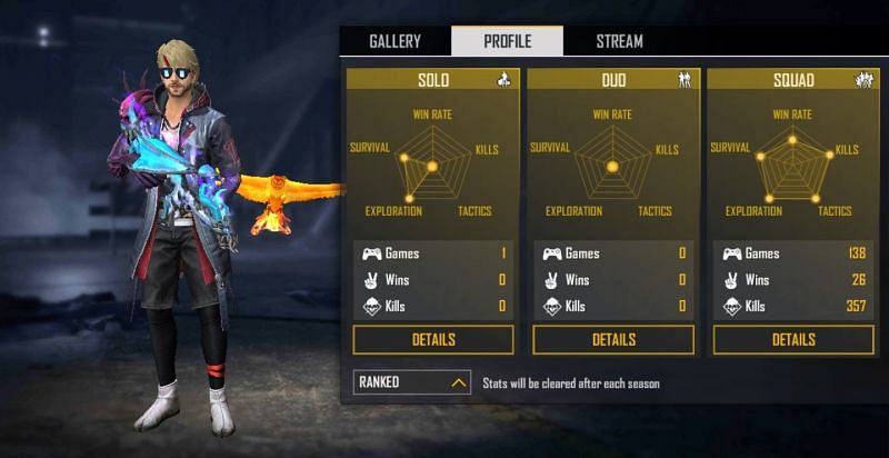 In the current ranked season, JIGS has played 138 squad games and has 26 Booyahs at a win ratio of 18.84%. He has racked up 357 kills, having a K/D ratio of 3.19.