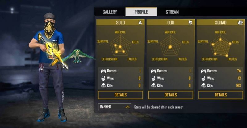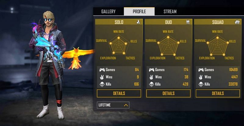 In the solo mode, he was featured in 84 games with 9 first-place finishes, maintaining a win ratio of 28.12%. He has also accumulated 106 kills with a K/D ratio of 1.41.