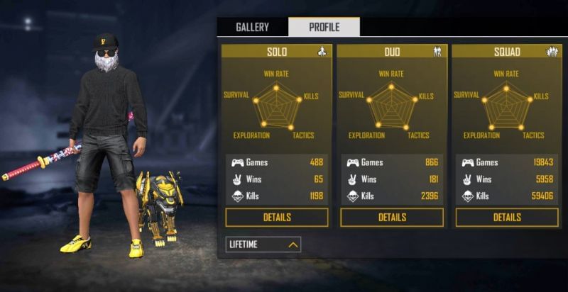 In the duo mode, the Indonesia-based YouTuber has played 866 matches and has triumphed in 181 of them, translating to a win rate of 20.90%. He has registered 2396 kills in these matches, with a K/D ratio of 3.50.