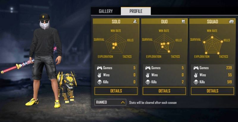LetDa Hyper has played 239 squad matches in the ongoing ranked season and has 55 Booyahs to his name, translating to a win rate of 23.01%. He has accumulated 519 kills and has a K/D ratio of 2.82 in this mode.