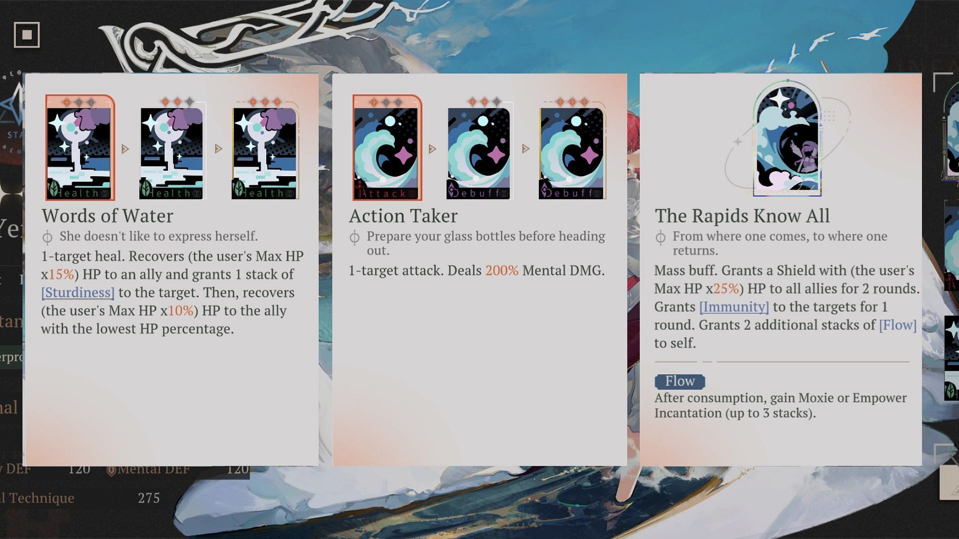 Insight III: When she casts an Incantation skill that heals, she consumes one stack of the Flow effect and enters the Empower Incantation I for one round. The effect of Empower Incantation I’s status only triggers if she is not already under the status effect.