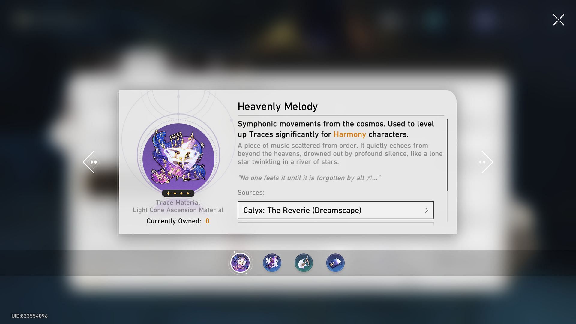 Another material you can pre-farm for Tribbie is her Trace level-up materials, Heavenly Melody/Celestial Selection/Firmament Note. You can acquire these by completing the Bud of Harmony – Crimson Calyx in The Reverie (Dreamscape). Since each clear of this activity requires Trailblaze Power, you must plan before they start farming these.
