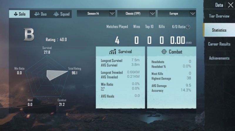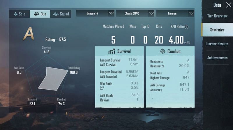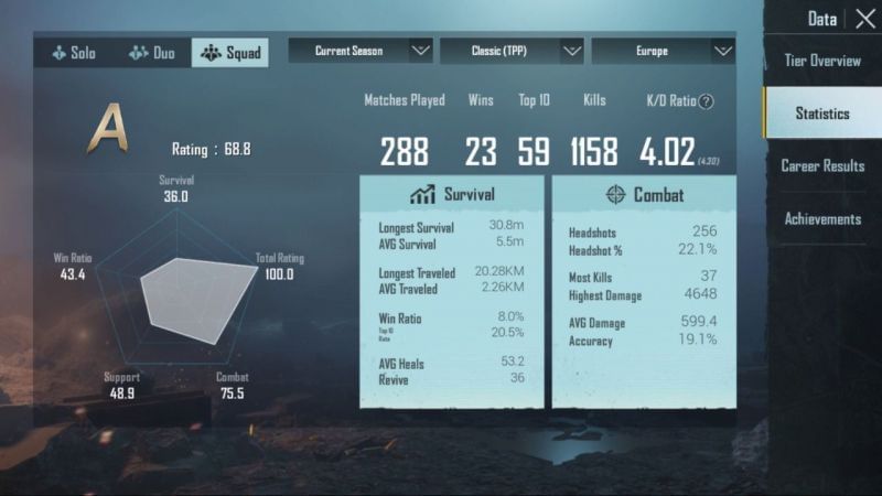 The famous content creator plays in the Europe server and has so far featured in 288 squad games. He has 23 wins to his name, which translates to a win rate of 8%, and has 59 top-ten finishes. He has also secured 1158 kills at a K/D ratio of 4.02 and has inflicted an average damage of 599.4.